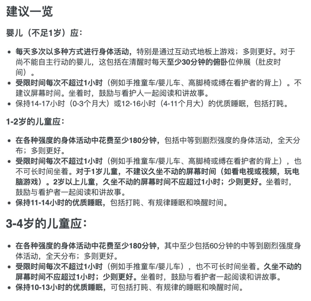 于是,我再一次找到了世卫组织的原文,标题为《为了健康成长,儿童需要少坐多玩:世界卫生组织》,至少在标题里我们没有看到「电子屏幕」的字眼,而关键词是「少坐多玩」。文章篇幅并不长,关于「少坐多玩」更具体的建议如下:
