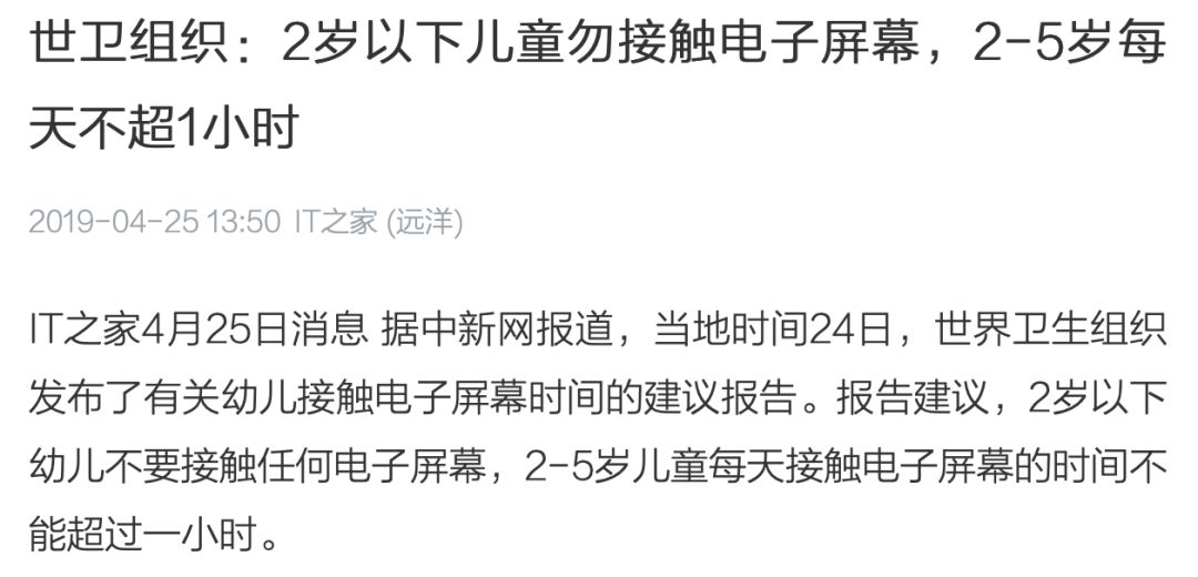 前几天看到一篇名为《世卫组织:2岁以下儿童勿接触电子屏幕,2-5岁每天不超1小时》的文章,内容很短,基本上就是对于标题的补充说明。