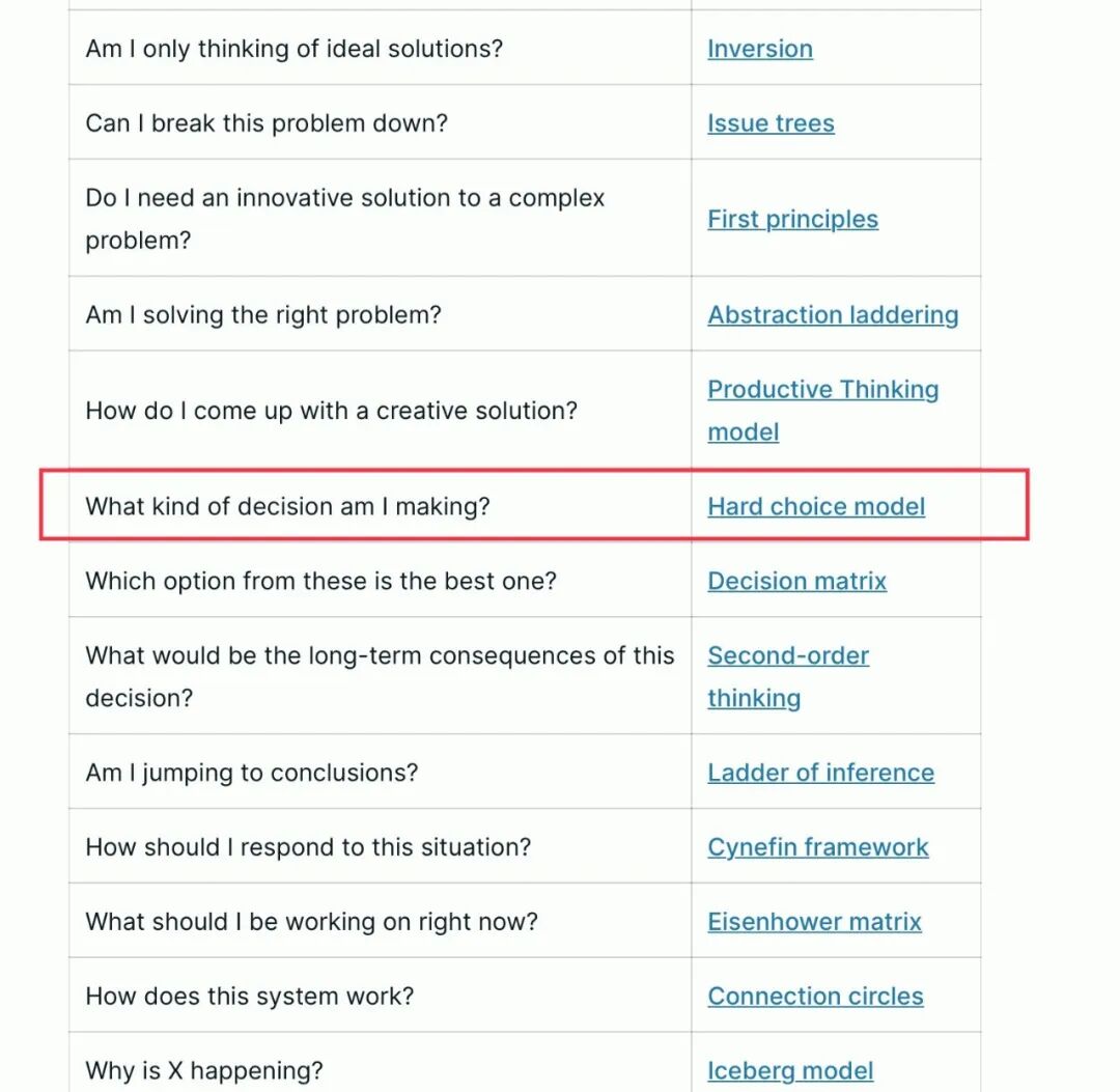 Hard Choice 属于「Decision Marking」的一种,页面上的概述,说明这个模型旨在于帮助你看清自己正在做出何种类型的决定: