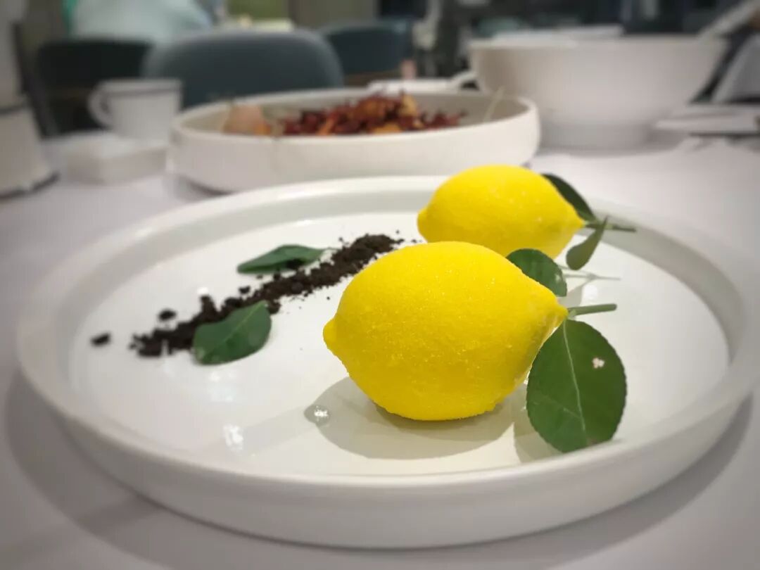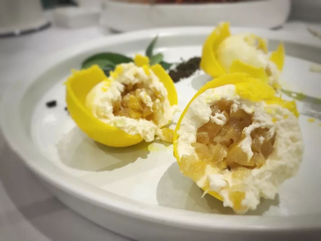 怎么样,第一反应就是两只完整的柠檬放在了盘子里,惟妙惟肖。是甜品,而不是水果,那么其中一定是暗藏奥秘,切开就真相大白了,外壳是类似XX酥皮,里面则是奶油+柠檬果肉,奶油的甜味与柠檬果肉的酸味搭配得刚刚好,酸甜中和,清甜不腻,口感极佳,不愧是招牌必点。这道甜品让人眼前一亮,比起之前假装「辣子鸡」那道,这道才是真正的创意所在。