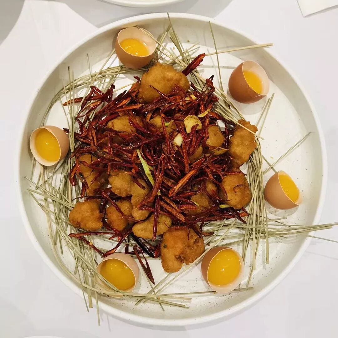 这莫非就是「创意」所在?原料还是辣子、鸡,菜名也是「辣子鸡」,但已然不是熟悉的做法,熟悉的味道,虽然味道还不错,也有创新点,比如点缀用的芒果汁做成了鸡蛋黄的样子,整个一盘菜就像是一个鸡窝,有鸡蛋、鸡、稻草,倒也算是新意。
