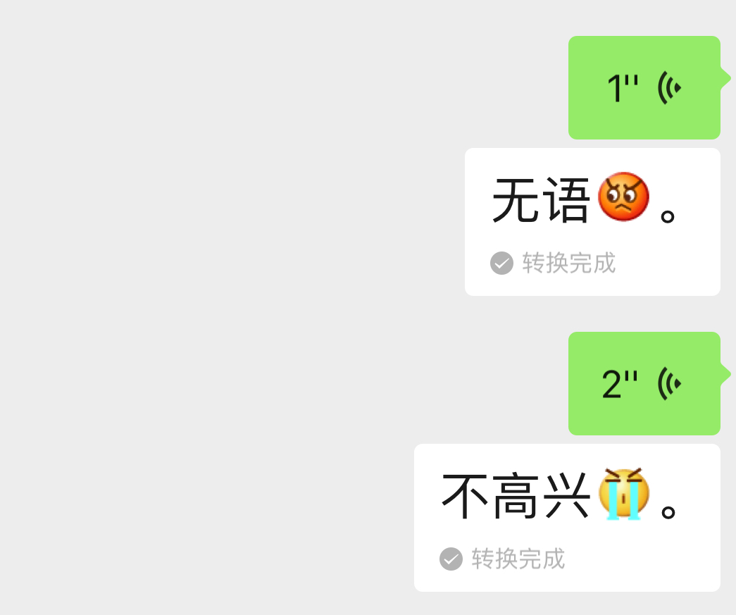 起因是跟朋友聊天,发了个语音过来,习惯性地转换成了文字,一转换有趣的事情来了,文字中「无语」后面加了一个气愤的表情,于是我又尝试了「不高兴」,得到的结果是这样的: