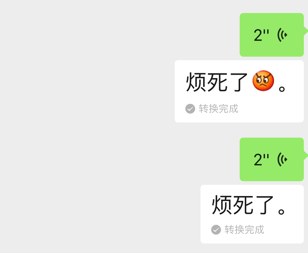 为什么,第二个「烦死了」没有表情呢?说下背景,在我说第二个「烦死了」的时候,我几乎是一个字一个字往外蹦的,相比第一个真的有那么一点点「烦死了」的情绪,第二个的语气和语调相对比较平和了。