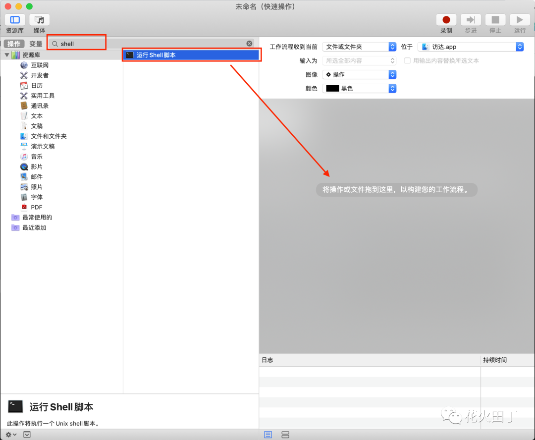 done准备好了脚本之后,我们在 Workflow 中添加 Shell 的运行组件,并把这段代码粘贴进去。