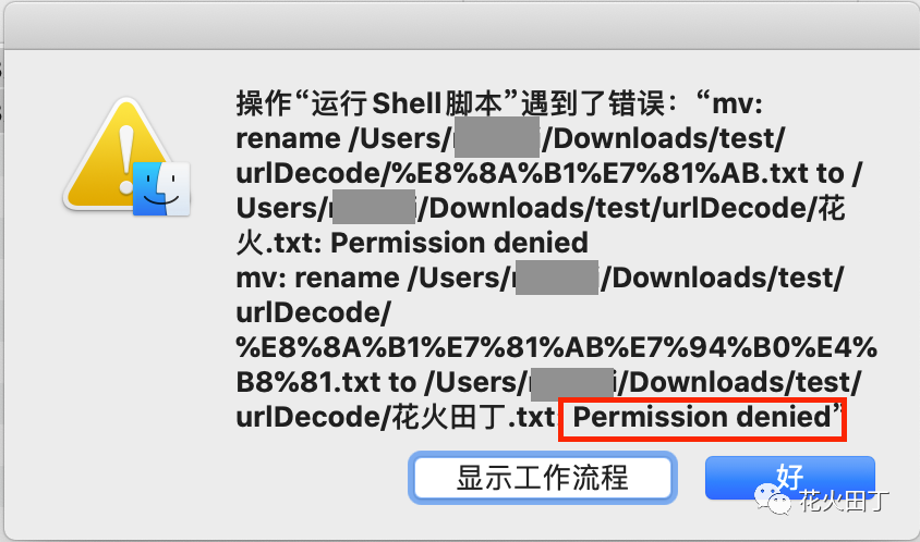 不出意料地报了个错,但报错提示里已经验证了我们 Workflow 的功能是 OK 的,URL 编码的文件名已经被“翻译”成了我们熟悉的中文字符,但因为文件权限的问题,导致重命名无法完成,而非 Workflow 本身设置有问题。