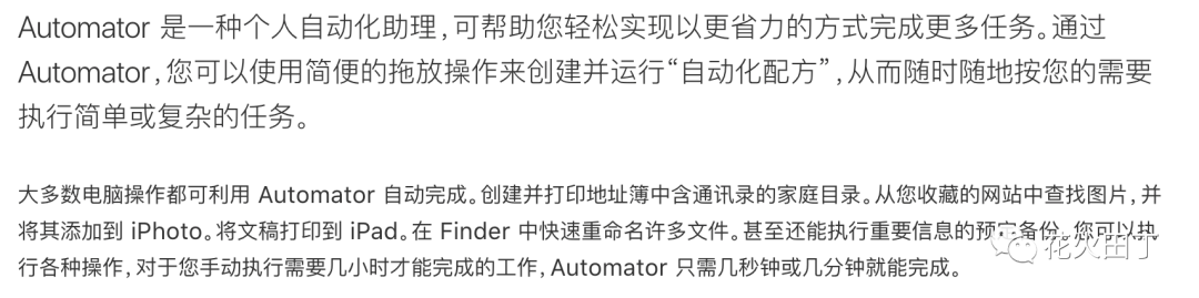Automator 自动操作,是个很强大的工具,强烈建议 Mac 的用户花点时间研究一下,可以把你从繁杂的琐碎中解放出来。Apple 官方的介绍如下1