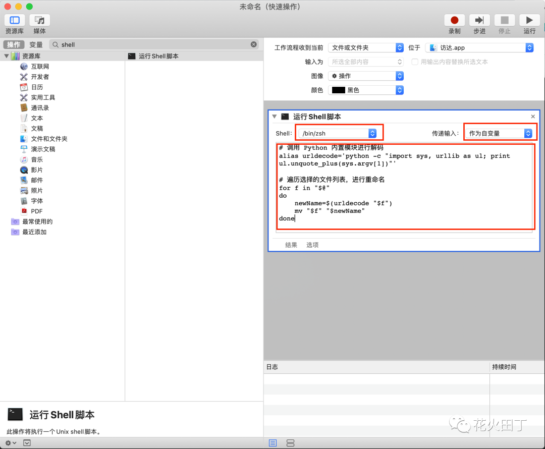 接下来,是最关键的一个步骤,我们需要写一个 Shell 脚本来执行具体的命名操作。Mac 天然带有 Python,所以可以很轻松地调用 Python 的 URL 编解码模块,让代码变得异常简单。