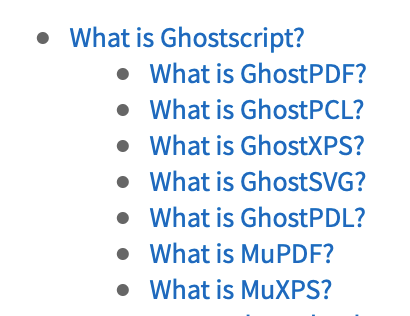 GhostScript 和 ImageMagick 一样使用起来也很简单,基本上可以用一句命令行搞定,但功能也是相当强大,PDF 也只是其中一部分,单看这个功能树就已经感受到它的强大了,更多请见官方文档2