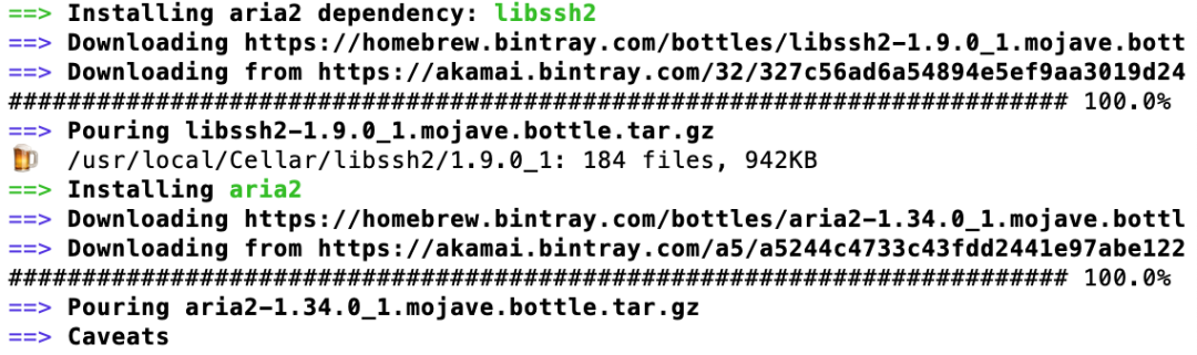 brew install aria2稍等一会儿,终端界面会开始下载依赖库,并安装 aria2,类似这样的界面: