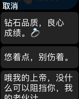 到了时间,条件反射似的打开训练功能,耗能、锻炼,看着彩色圆环逐一合上,成为了每天必备的功课。这一切都要归功于Watch的健身记录功能,人性化的提醒,暗戳戳的鼓励,让你不好意思,或者说不忍心拒绝Ta,如果还开启了好友共享功能,好友们猝不及防接二连三地「叮」一声,获得新奖章或者完成训练的通知,也会时刻提醒你不要犯懒啦。每次提醒也会随机出现一套很好玩的回复,有调侃也有膜拜,皮一下,很开心。比如这样的: