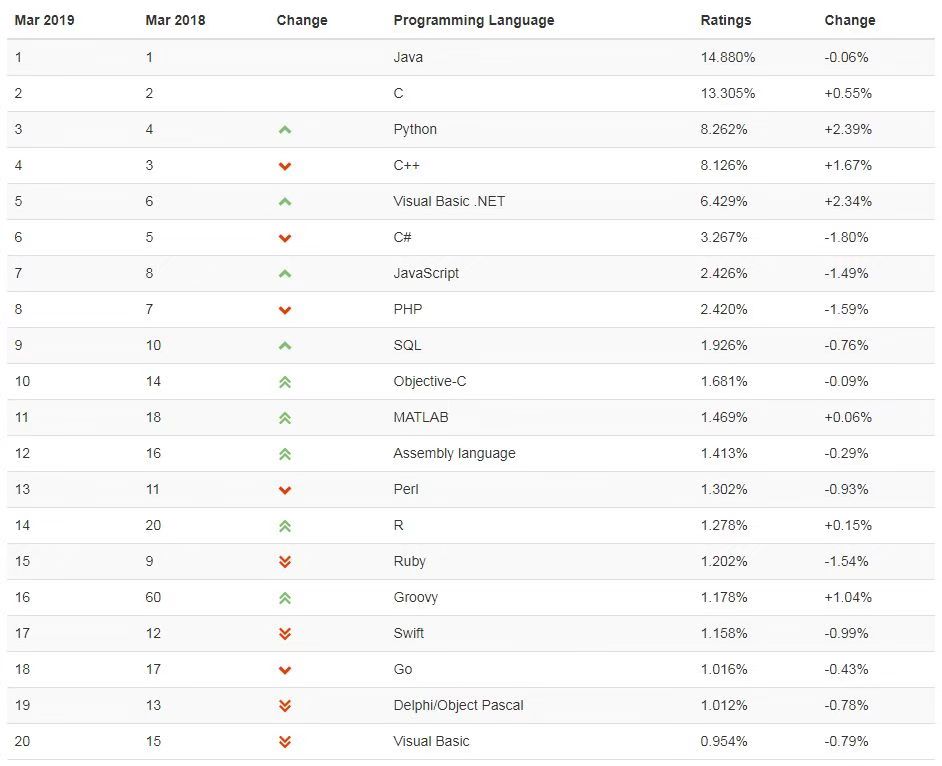 从 TIOBE 2019年3月这张图上来看,Python 的受欢迎程度已位居第三位,仅次于 Java 和 C。