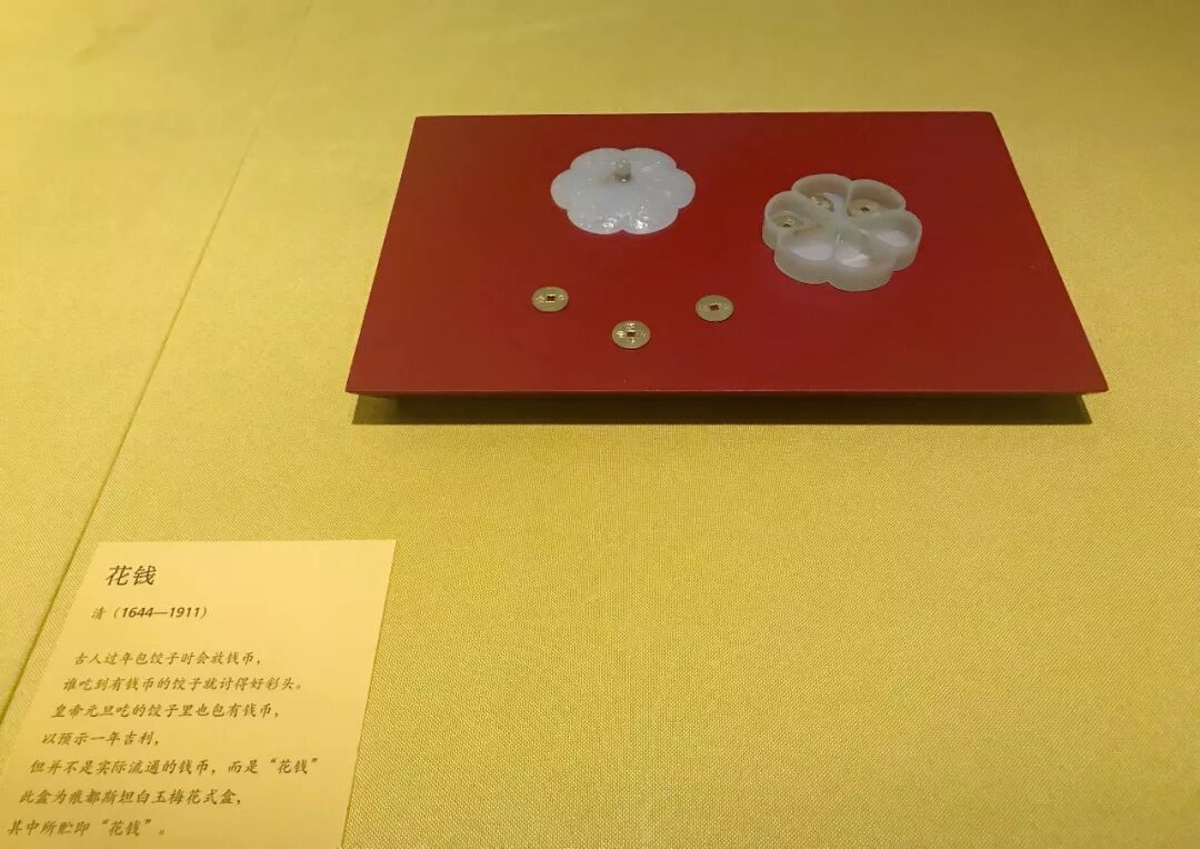 说起来惭愧,对于一些展品的认知多数都来自清宫剧(史书看了也很少能记住)。比如饺子里会放钱,吃到的人就会有好彩头。不曾想这钱还有个专属的名字 —— 「花钱」,也并不是平日里流通的钱币,是特意铸造的一种。
