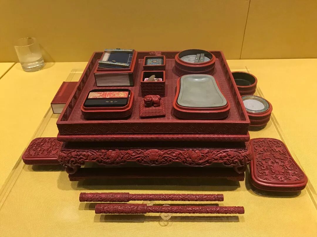 还有很多精雕细琢的器具和挂饰,比如钱袋子和撒落一旁的压岁钱,和一套看上去很迷你的文房四宝。