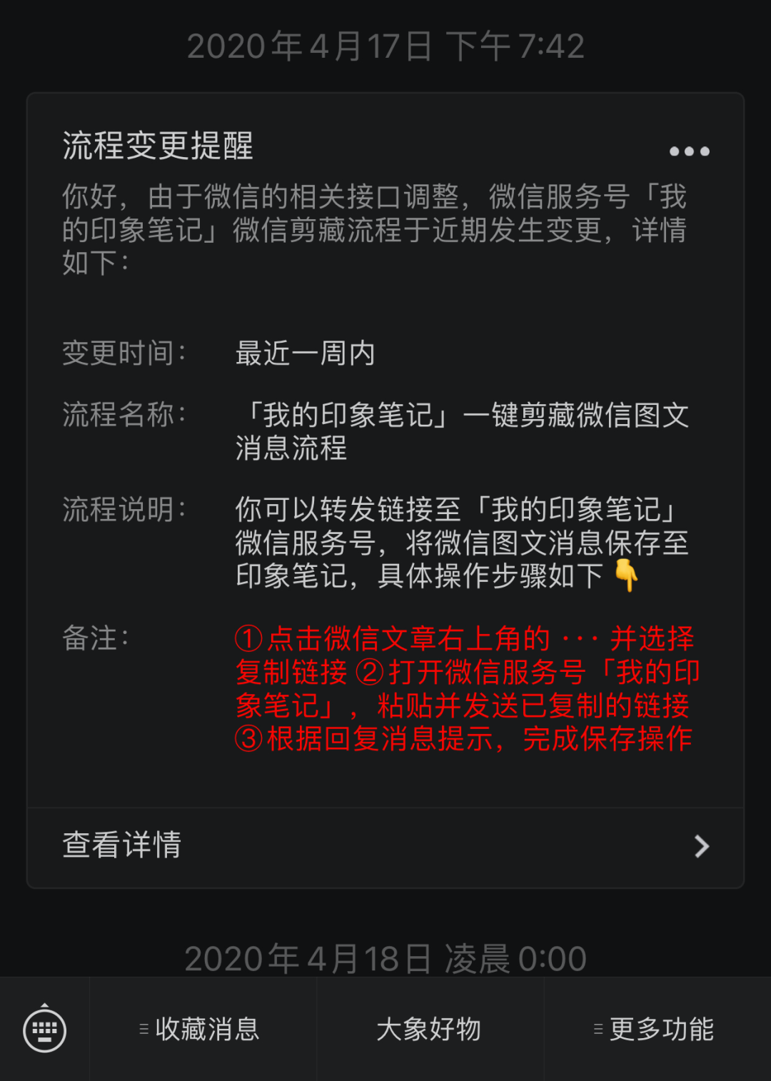 直至今年1月,微信文章无法直接使用「保存到我的笔记」,联系在线客服,说是服务器正常,然后直到晚上,收到了推送的消息通知: