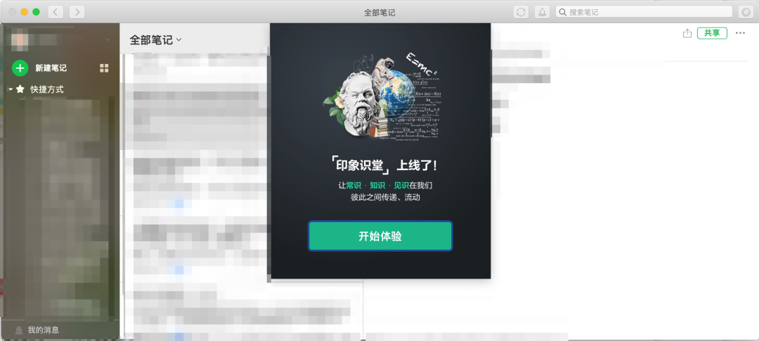 除了点击「开始体验」没有任何办法关掉这个位于最顶层的弹窗,也没办法打开任何笔记,强制结束进程后也是如此。为了能够尽快继续查找笔记,我非常不情愿地点击了「开始体验」,然后就跳到了「印象识堂」的界面,匆匆扫了一眼,类似「知识付费+社交」。