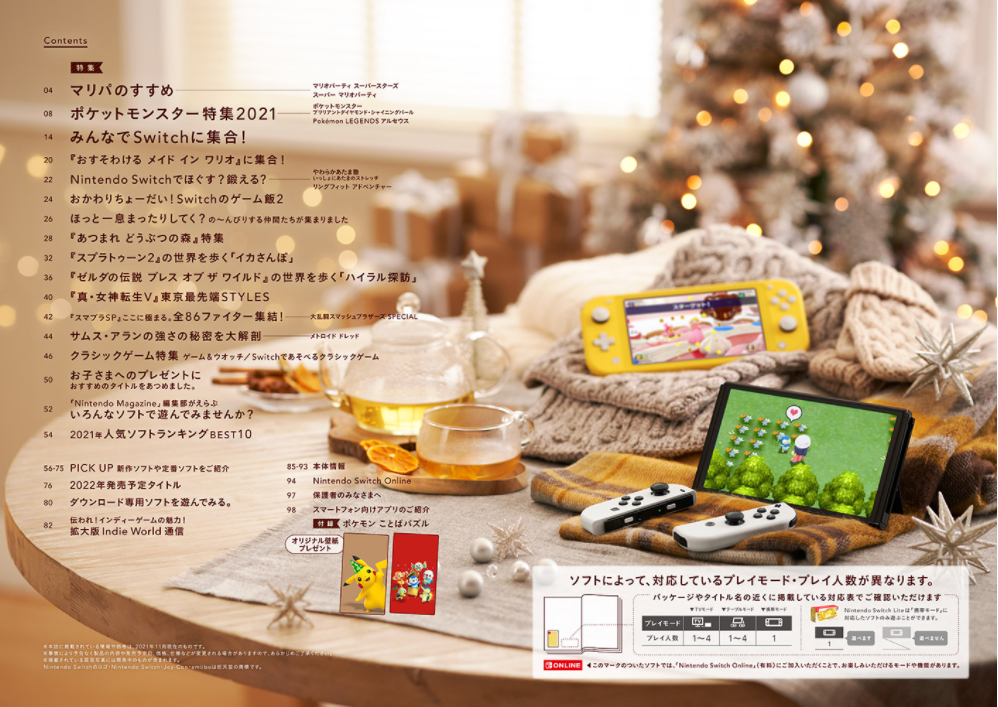 任天堂今日发布了2021年冬季杂志的数字版[8],杂志足足100页。内容介绍了许多第一方的游戏,还有宝可梦特集。杂志为日语版,但是内容图片较多。