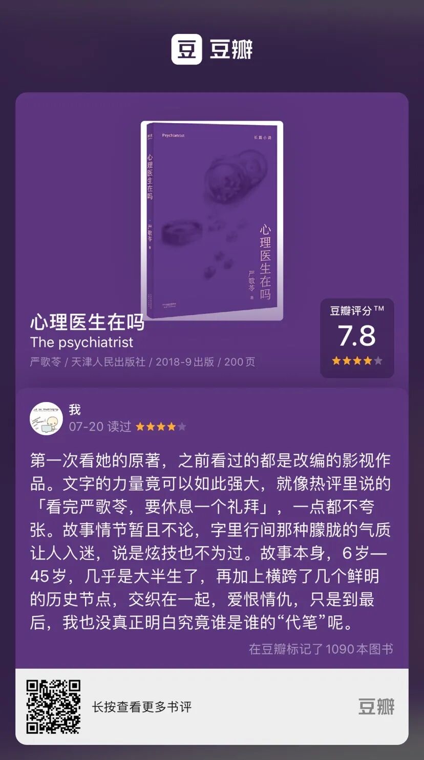 这次看的是《心理医生在吗》,不太记录是怎么选到这本书的,大概又是 KU 推荐吧。原著还是让我觉得挺震撼的,暂且不谈小说的内容和时代背景,豆瓣有个评论写「这是本炫技之作」,真是一点都不夸张。很多心理活动的描写,真是很妙了,字里行间你看不到任何直接表明心迹的字眼,但那些个词早就在你眼前盘旋了。