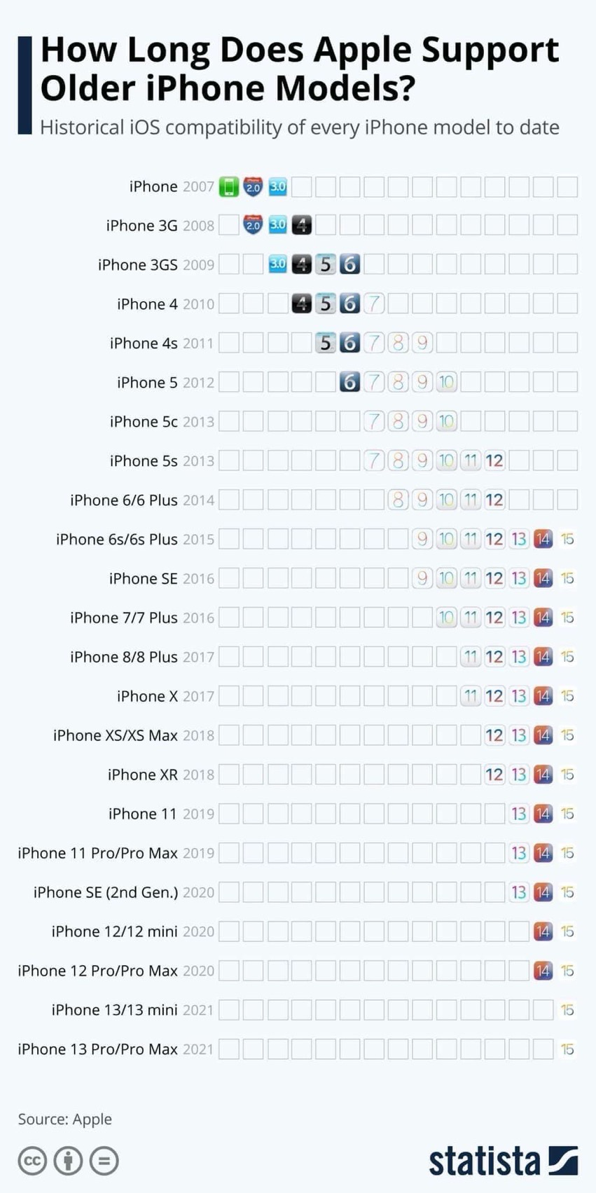 作为果粉,我还是拿 Apple 举例吧,虽然乔布斯去世以后,Apple 产品饱受争议(但其实说归说,每年买买买的人并没有少),商业化味道变浓了,但首先要考虑的是,苹果的确是一家商业公司,而且每年要创新,投入很多,当然也需要恰饭啊。但看以下这张兼容图,基本上每款手机都可以支持6-7代的系统升级,已经很良心了。
