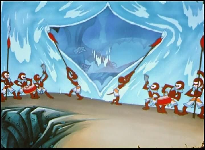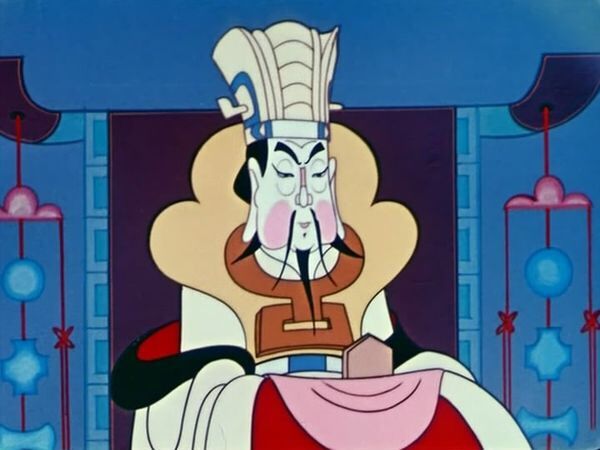 我开始怀疑儿时是不是真的看过这部影片,答案是肯定的,因为所有与大圣有关的画面都记得很清楚,偷吃蟠桃、大战三太子、迎战天兵天将、变成一座带尾巴的寺庙。儿时所有的注意力都集中在大圣身上,其他的大概都是浮云,甚至都没有正眼瞧过玉帝和王母一眼,以至于今天在这巨幕上看到他俩,无论是表情、相貌、言谈都着实让我小吃了一惊。这「一惊」还得“归功于”很多真人版电视剧,剧中找来扮演玉帝和王母的可都是仪表堂堂呢,玉帝玉树临风,王母风姿绰约,哪像以下这两位。