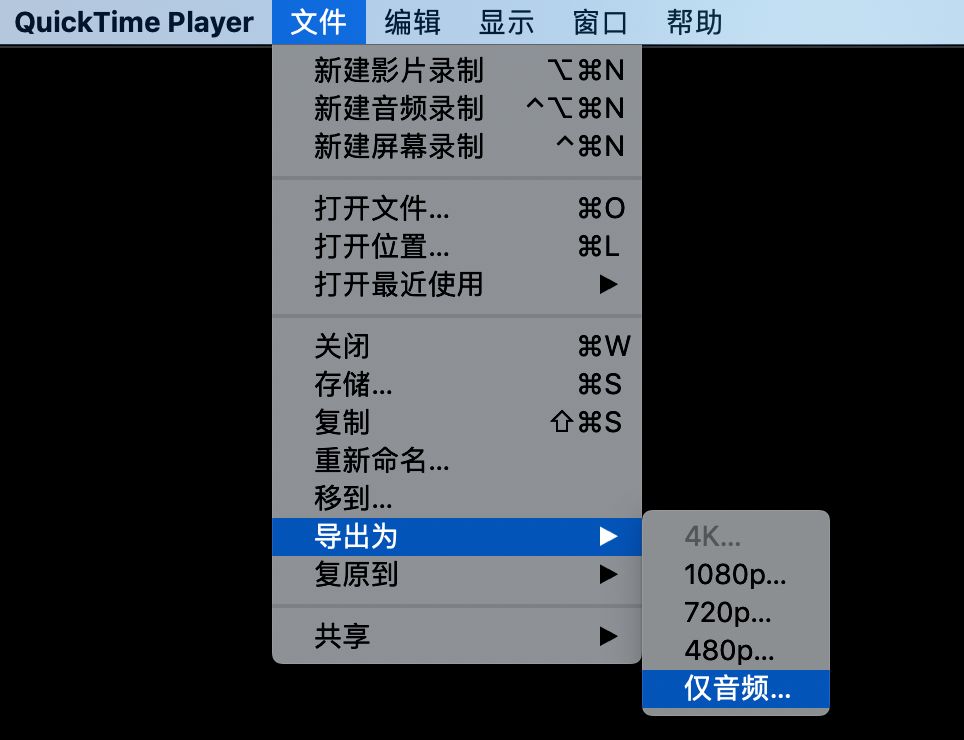 有了 MV,剩下的事情就非常简单了,从 MV 中提取音频即可。有很多视频处理工具都有这个功能,今天我们用到的是 Mac 上自带的 QuickTime Player。